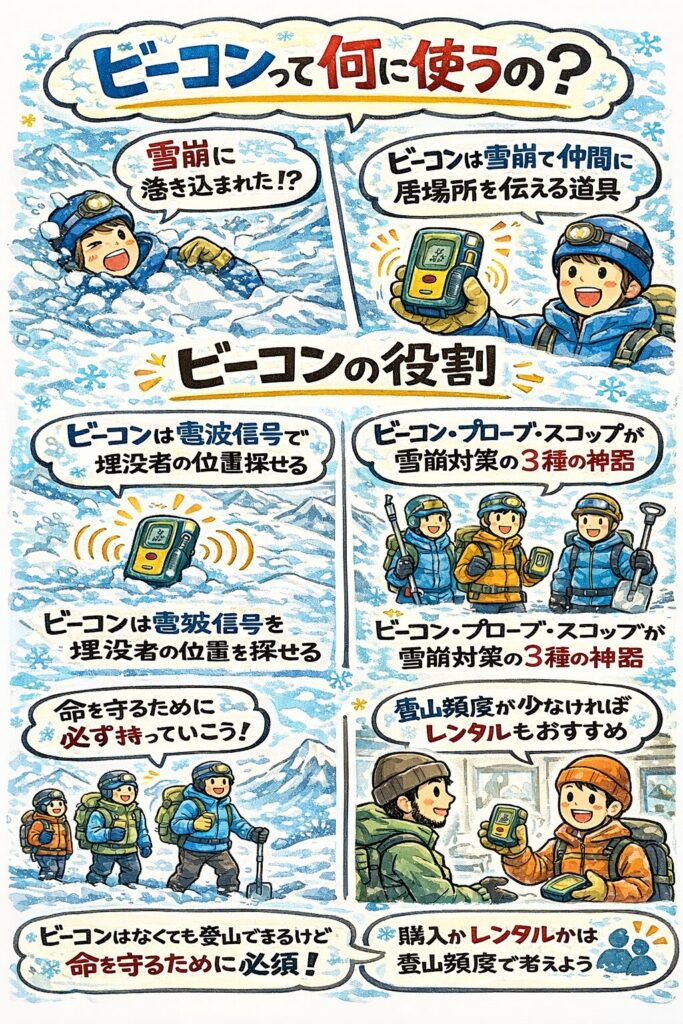 ビーコンは雪崩に巻き込まれたときに同行者の命を救うと共に、自身が見つけてもらうために必須な道具なので、何に使うのか、どんなものを選べば良いか考えてみましょう!