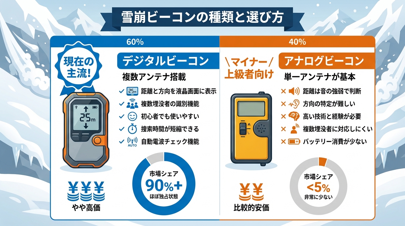 コスパを考えるなら、デジタル式です。実際のところ、ビーコン利用者の9割はデジタル式を選んでいます。
