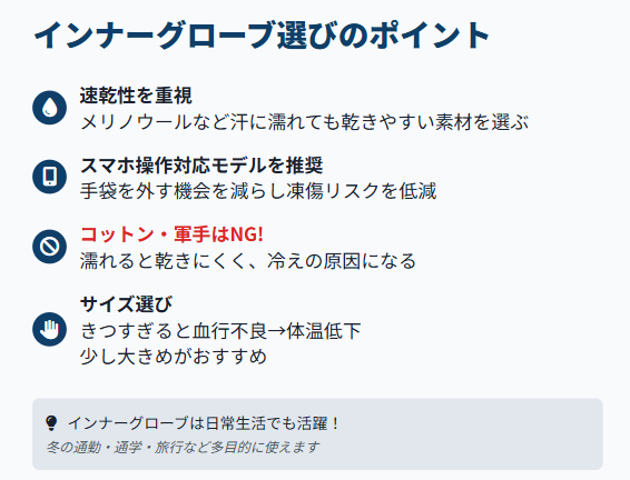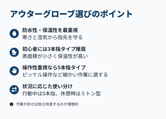 なぜ重要かというと、指先は凍傷のリスクが最も高く、選択を誤ると思わぬ事故や後悔に繋がるからです。