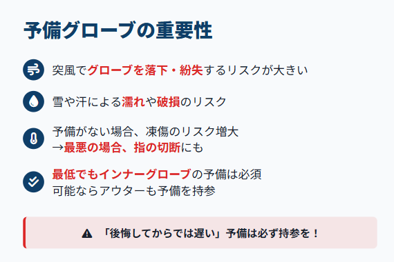 こういった落下だけでなく、予期できないトラブル等で手袋を濡らしてしまったり、破れがおきたときに予備がないと凍傷になって指を切断することにもなりかねません。