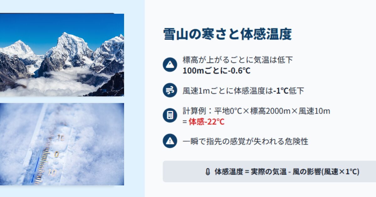 平地が0度で山頂が標高2000mでも風速10mの風があれば体感気温は-22度です。