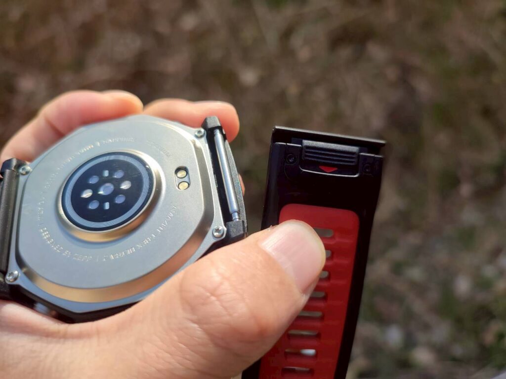 下位モデルとは異なり、ワンボタンでバンドが取り外しできるので、汗が気になる場合も洗いやすい構造です。
