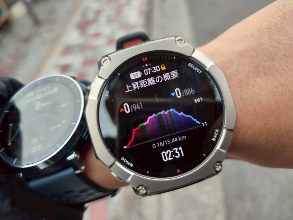 登山でも日常でも、必要な情報を手元でサッと確認できるので、T-Rex Ultra2の多機能性を最大限に活かせるポイントと言えるでしょう。